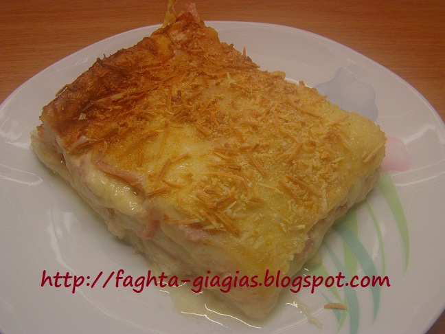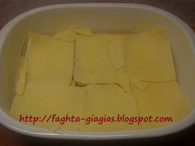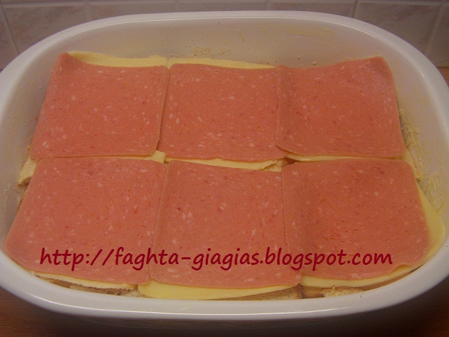 | Στρώνουμε τις μισές φέτες γκούντα και συνεχίζουμε στρώνοντας το υπόλοιπο ψωμί. | |