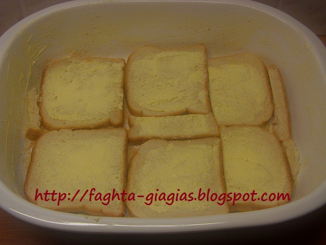 | Βουτυρώνουμε πολύ καλά ένα πυρέξ και το πασπαλίζουμε με την μίση φρυγανιά. Αλοίφουμε τις φέτες του ψωμιού, από τη μια πλευρά, με λίγη μαργαρίνη και στρώνουμε τις μισές στο πυρέξ, με την αβουτύρωτη πλευρά προς τα κάτω. (Αν υπάρχουν κενά ανάμεσα στις φέτες, τις κλείνουμε με κομμάτια ψωμιού). |