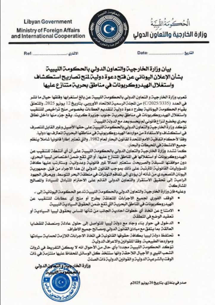 Το Υπουργείο Εξωτερικών και Διεθνούς Συνεργασίας της κυβέρνησης της Λιβύης εκφράζει τη βαθιά έκπληξη και ανησυχία του για όσα δημοσιεύθηκαν στο τεύχος (2025/3335/C) της Επίσημης Εφημερίδας της Ευρωπαϊκής Ένωσης, της 12ης Ιουνίου 2025, σχετικά με το ότι η ελληνική κυβέρνηση έχει προκηρύξει διεθνή διαγωνισμό για άδειες εξερεύνησης και εκμετάλλευσης υδρογονανθράκων σε θαλάσσιες περιοχές νοτίως της Κρήτης, μέρος των οποίων υπόκειται σε ανεπίλυτη νομική διαμάχη με το κράτος της Λιβύης.