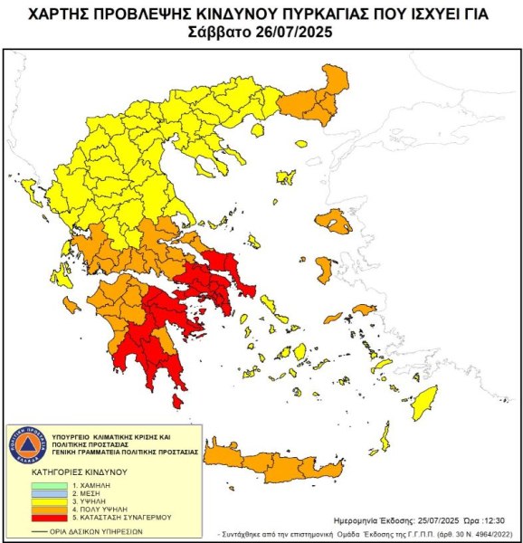 Σε καθεστώς ακραίου κινδύνου πυρκαγιάς (κατηγορία 5) τίθενται για αύριο, Σάββατο, εννέα περιοχές της χώρας, ανάμεσά τους και η Αττική, σύμφωνα με τον Χάρτη Πρόβλεψης Κινδύνου Πυρκαγιάς που εκδίδει καθημερινά η Γενική Γραμματεία Πολιτικής Προστασίας του Υπουργείου Κλιματικής Κρίσης και Πολιτικής Προστασίας.