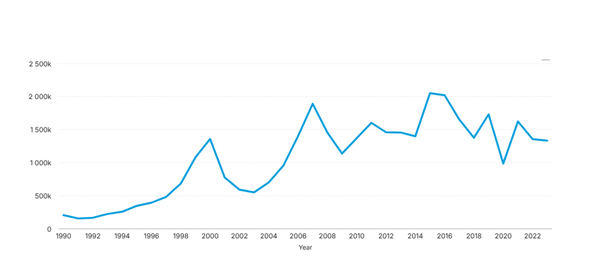 Το δεύτερο μέγεθος αναφέρεται στις παγκόσμιες εισροές Άμεσων Ξένων Επενδύσεων , που και αυτές εξακολουθούν να διατηρούνται σε υψηλά επίπεδα, σύμφωνα με τα στοιχεία του Γραφήματος 1, εν μέσω οικονομικής επιβράδυνσης και αυξανόμενων γεωπολιτικών εντάσεων, σύμφωνα με την Παγκόσμια Έκθεση Επενδύσεων 2024 ( World Investment Report 2024) .