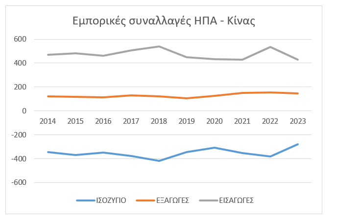 Θα πρέπει να ειπωθεί παράλληλα ότι η προσπάθεια των ΗΠΑ να κρατηθούν στην κορυφή του πλανητικού συστήματος, εκτός του ότι έχει λάβει σχεδόν μανιχαϊστικά χαρακτηριστικά (το καλό εναντίον του κακού) στο επίπεδο της πολιτικής επί εποχής διακυβέρνησης της χώρας από τους Δημοκρατικούς, ειδικά μετά την ουσιαστική απώλεια της heartland της Ευρασίας, αλλά και την σημαντική μείωση της αμερικανικής επιρροής στην ευρωασιατική remland περιλαμβάνει και μέτρα οικονομικού χαρακτήρα τα οποία, υπενθυμίζεται ότι άρχισαν με την πρώτη προεδρία Τραμπ, προκειμένου να περιοριστεί με κάθε κόστος η οικονομική και τεχνολογική εξάπλωση της Κίνας. Βέβαια οι δασμοί και τα υπόλοιπα περιοριστικά μέτρα που επιβλήθηκαν από τον Τραμπ και συνεχίζονται από τον Μπάιντεν, δεν βελτίωσαν καθόλου το εμπορικό έλλειμμα των ΗΠΑ με την Κίνα. Το εμπορικό έλλειμμα συνέχισε να διατηρείται, κατά μέσο όρο σταθερό, τόσο επί πρώτης προεδρίας Τραμπ όσο και επί προεδρίας Μπάιντεν (Γράφημα 4)