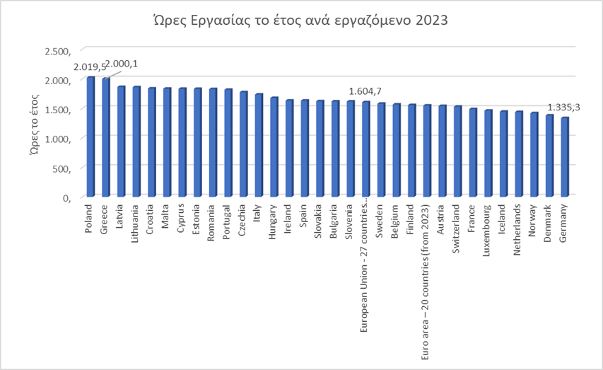 Από την άποψη αυτή είναι ενδιαφέρον να σημειωθεί ότι στην Ελλάδα από το παραγόμενο προϊόν ανά εργαζόμενο μόλις το 33% αποτελεί την αμοιβή των εργαζομένων όταν ο μέσος όρος των χωρών της Ευρώπης (Ε.Ε.-27) είναι 41%. Στην Βουλγαρία οι εργαζόμενοι αμείβονται με το 35% του παραγόμενου προϊόντος ανά εργαζόμενο, τη στιγμή μάλιστα που οι Έλληνες εργάζονται τις πιο πολλές ώρες (2.000 ώρες) ετησίως ανά εργαζόμενο, πίσω μόνο από την Πολωνία με 2.019 ώρες ανά εργαζόμενο το έτος, με τον μέσο όρο των χωρών της Ευρώπης να είναι στις 1.604 ώρες ετησίως και στην Βουλγαρία ο κάθε εργαζόμενος εργάζεται 1.617 ώρες το έτος (Δάγραμμα).