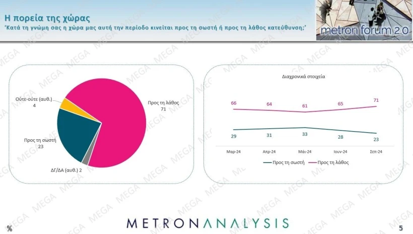 H απαισιοδοξία και η ανησυχία για την πορεία της χώρας αποτυπώνεται και στη νέα δημοσκόπηση της Metron Analysis όπου επτά στους 10 πολίτες εκτιμούν ότι κινείται προς τη λάθος κατεύθυνση με το ποσοστό μάλιστα να έχει αυξηθεί κατά έξι μονάδες σε σχέση με τον Ιούνιο. Μόλις το 23% απαντά πως η χώρα κινείται προς τη σωστή κατεύθυνση.